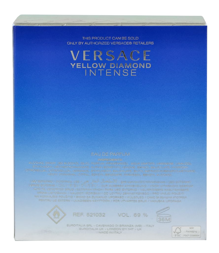 عطر ادکلن ورساچه یلو دیاموند اینتنس-Versace Yellow Diamond Intense، از نظر رایحه شباهت زیادی به نسخه یلو دایموند که 3 سال قبل تر عرضه شده بود دارد با این تفاوت که پخش بو و ماندگاری آن بطور محسوسی افزایش پیدا کرده. نسخه اینتنس عطری است نسبتا پیچیده بر پایه رایحه مرکبات، میوه ها و گل ها.