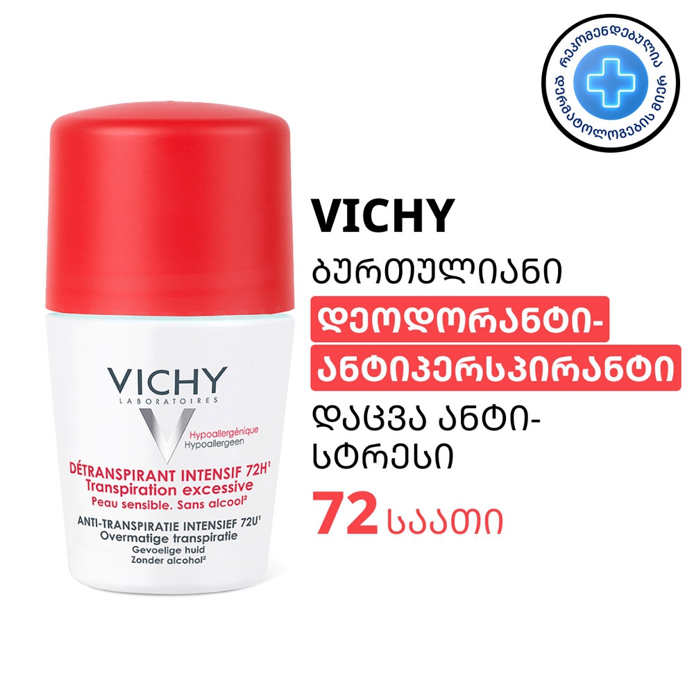 رول دئودورانت ضدتعریق 72 ساعته ویشی محصول کشور فرانسه بوده و قادر است تا میزان تعریق بدن در ناحیه زیر بغل را کنترل نماید. این محصول از فرمولاسیون ویژه ای ساخته شده و از بروز حساسیت، التهاب، خارش، قرمزی و سوزش در نواحه زیر بغل جلوگیری خواهد کرد. این محصول دارای رایحه ای بسیار مطبوع و ماندگاری 72 ساعته نیز می باشد.