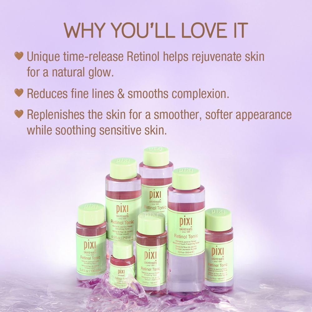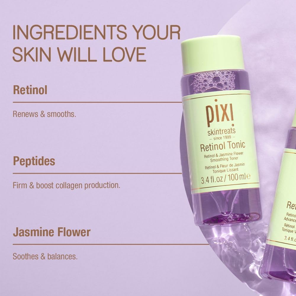تونر رتینول پیکسی (Pixi Retinol Tonic) یکی از محصولات محبوب برند پیکسی است که با فرمولاسیون حاوی رتینول پایدار، پپتیدها و عصاره گل یاس طراحی شده تا به جوانسازی، بازسازی و بهبود بافت پوست کمک کند.