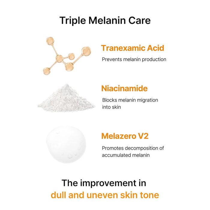 🌿 ترکیبات کلیدی محصول Niacinamide (نیاسینامید ۵%): روشنکننده، کاهش لک و تقویت سد دفاعی Tranexamic Acid (ترانکسامیک اسید ۳%): ضد لک، کاهش تیرگی و هیپرپیگمانتاسیون Melazero V2 (۱%): مهارکننده ملانین و بهبود ناهمواری رنگ پوست Houttuynia Cordata Extract (عصاره هوتوئنیا کورداتا): آرامبخش و ضدالتهاب Allantoin (آلانتوئین): نرمکننده و ترمیمکننده پوست Hyaluronic Acid (هیالورونیک اسید گیاهی): آبرسانی عمیق و حفظ رطوبت